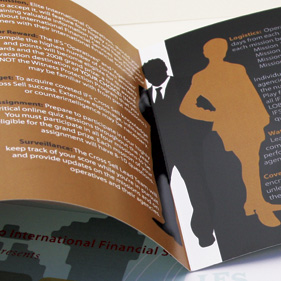 Who doesn't love brochures that fold out in cool and interesting ways? Nobody, that's who. One of the most well-liked ways to take advantage of the printed medium's capabilities is to make a brochure more interactive with custom fold-out panels and unique construction. This design feature can be used to lead the reader through a story, to illustrate a point, to create a 3D display, to contain other materials, or just to plain old knock the socks right off of your readers! We've done several of these for our clients, and they've been a hit every single time. Take a look at some of these: