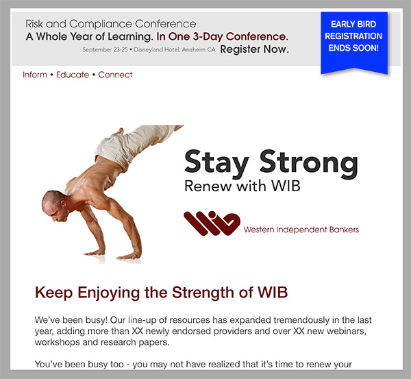 When we worked with Western Independent Bankers to improve how they used email campaigns to communicate with their members, we identified a dozen common functional categories such as announcing a conference, a webinar, a new product, sending a press release, and so on, and we created a template for each of these categories. Our goal was to make it as easy as possible for the internal team to quickly send out an email.